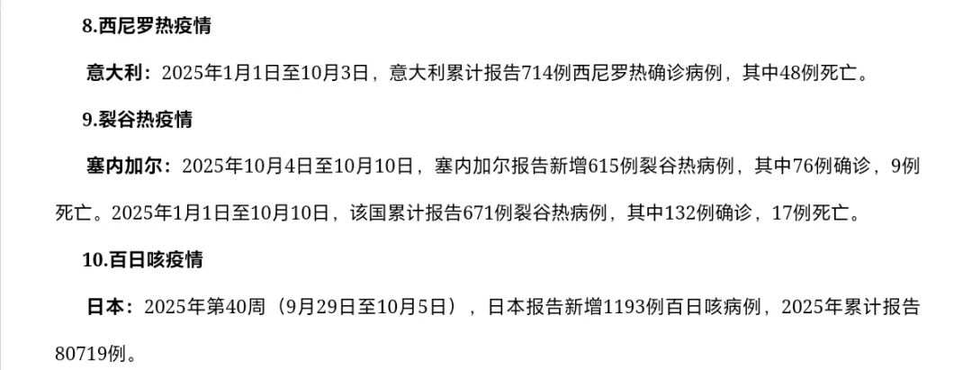 但热闹背后藏着健康暗礁:就在本月,苏州市疾控中心发布预警,尼泊尔登革热疫情已扩散至全国 97.4% 的地区,累计超 6000 人感染;加拿大麻疹病例突破 5000 例,意大利西尼罗热致死近50人,日本百日咳年累计病例更是高达8万余例。更值得警惕的是,非洲正处于蚊媒传染病高发期,疟疾病例占全球 95%,而中韩航线的密集往来,也让流感、消化道疾病的跨境传播风险陡增。