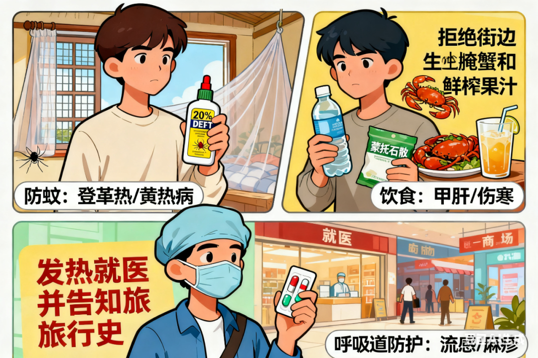 在韩国明洞、加拿大商场等密集场所戴口罩,随身携带退烧药(对乙酰氨基酚)。若在国外出现发热,别自行吃药掩盖症状 —— 疟疾潜伏期可达数月,回国后 21 天内发烧需立即就医,并主动告知旅行史。